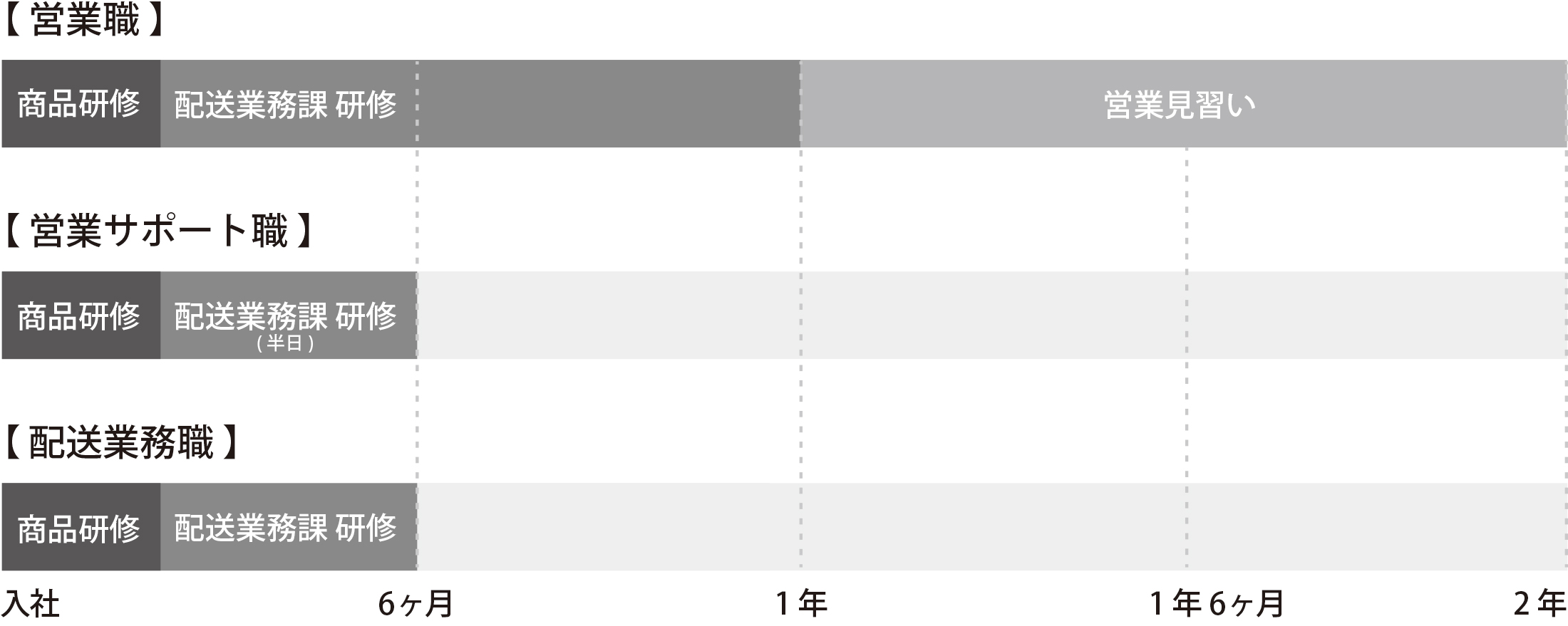 営業職と配送業務職は、普通自動車免許AT限定解除・準中型免許・中型免許が必要になります。(会社全額補助)